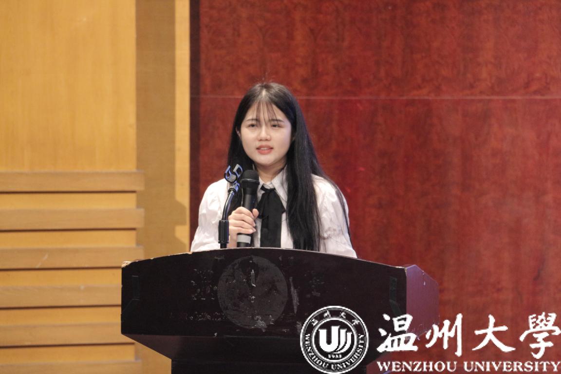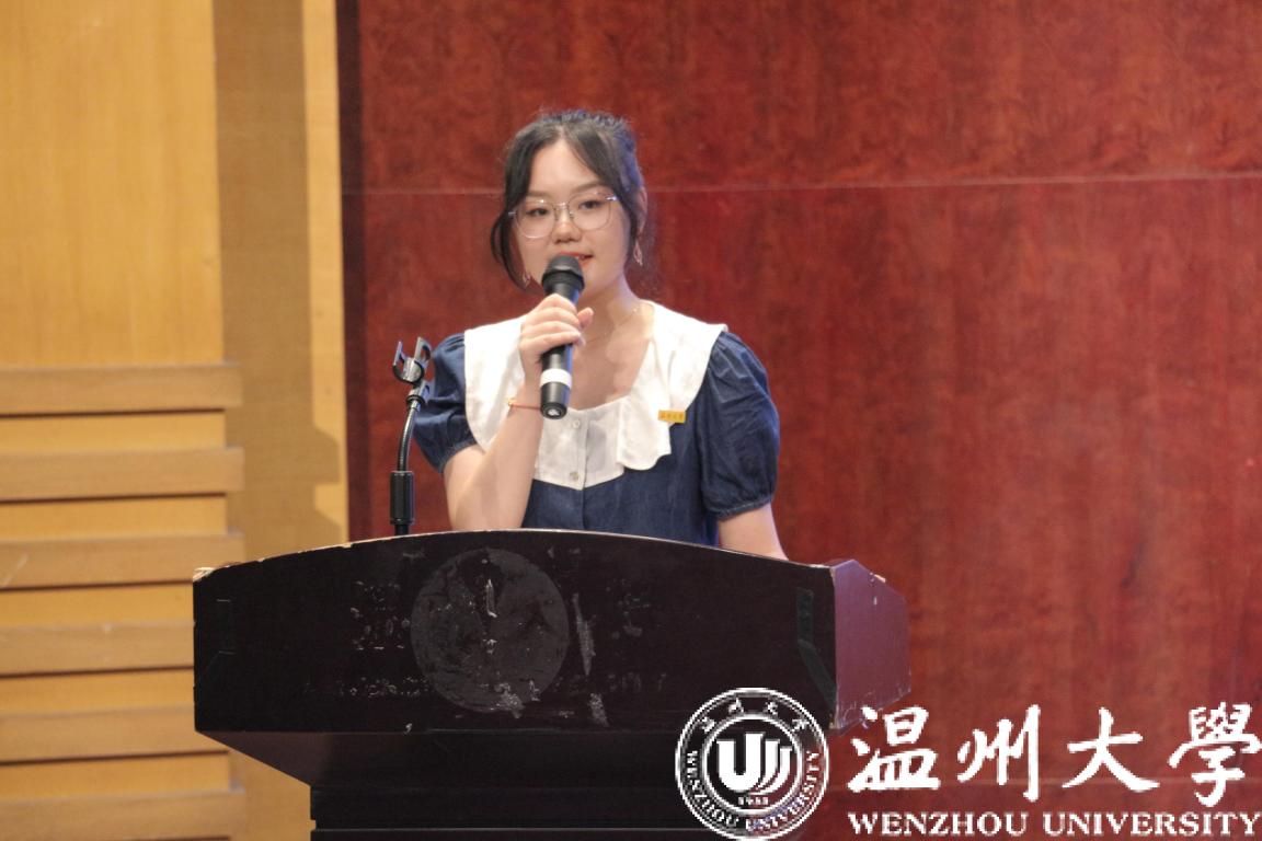 研究生新生代表杨钰莹同学发言。杨钰莹同学讲述了5年在温大av天堂 的求学经历,提出了对自己未来漫漫求学路的期望,潜心磨砺、携手同行,共同谱写壮美的青春篇章。