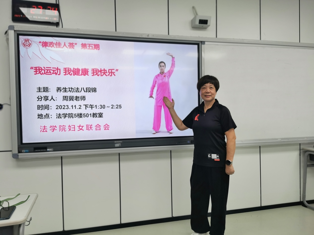 11月1日下午,av天堂 “律政佳人荟”第五期在2号楼501教室举行。本期活动的主题是“我运动、我健康、我快乐”,特别邀请到周冀老师和大家分享健身气功“八段锦”。