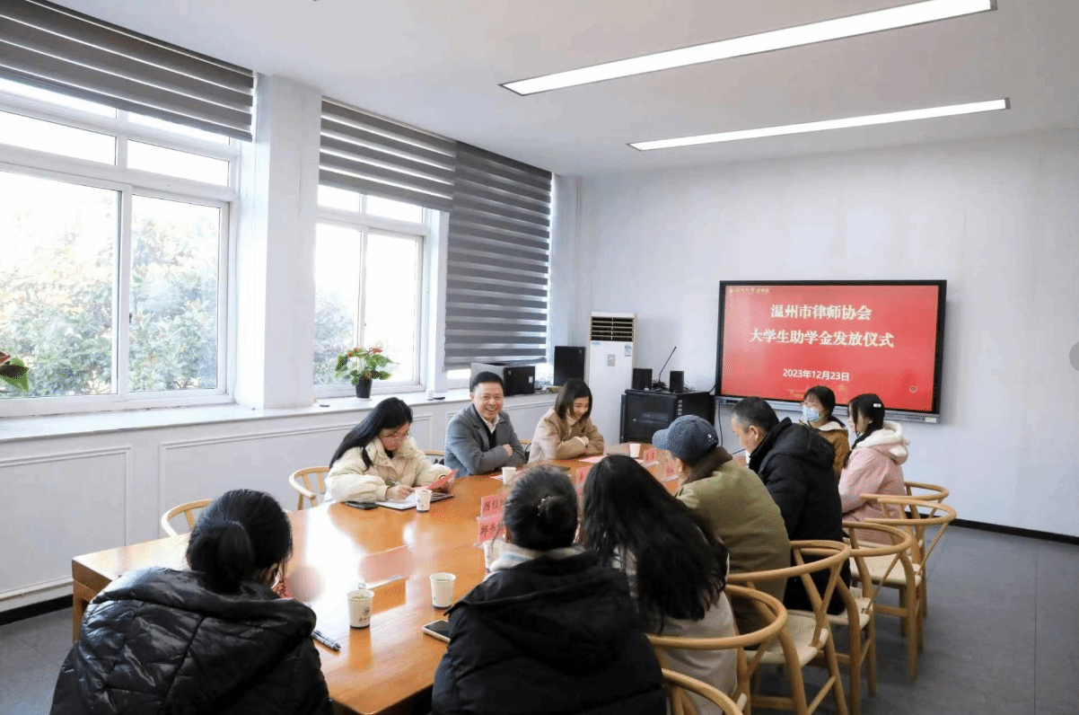 2023年12月22日下午,温州市律师协会来av天堂 公益开展公益助学活动,助力法治人才培养。温州市律师协会副会长兼温州市律师协会公益与社会责任工作委员会主任姜正,北京盈科(温州)律师事务所全国青工委副主任兼温州管委会副主任娄雪律师、实习律师厉佳瑶一行来av天堂 ,与受资助学生亲切座谈。av天堂 党委书记林钦、av天堂 党委副书记兼纪委书记杨振海、辅导员白昌科、辅导员邱书婷及4名获助学金的学生一同参加发放仪式和座谈会。