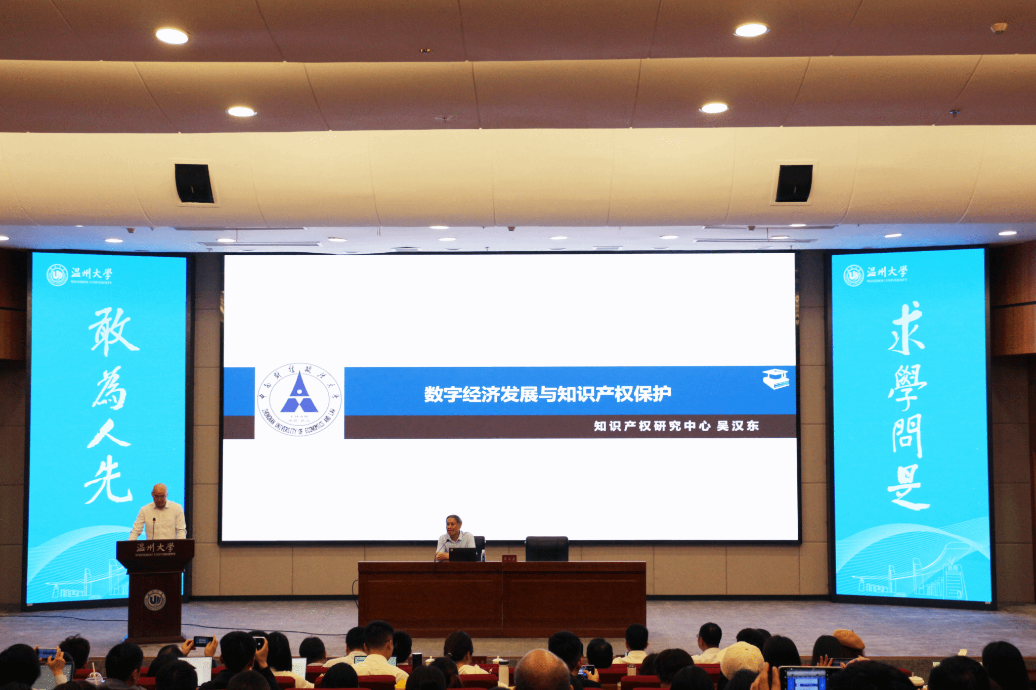 5月23日下午,中南财经政法大学原校长、博士生导师吴汉东教授受邀做客“温州法治大讲坛”,在av天堂 育英图书馆学术报告厅做了一场题为“数字经济发展与知识产权保护”的学术讲座。本次讲座由中共温州市委政法委员会、温州市法学会、av天堂 主办,温州市律师协会、温州市知识产权协会协办,吸引了来自全市220余名专家、学者、律师和学生前来参加。av天堂 党委委员、纪委书记李都金出席了本次活动。