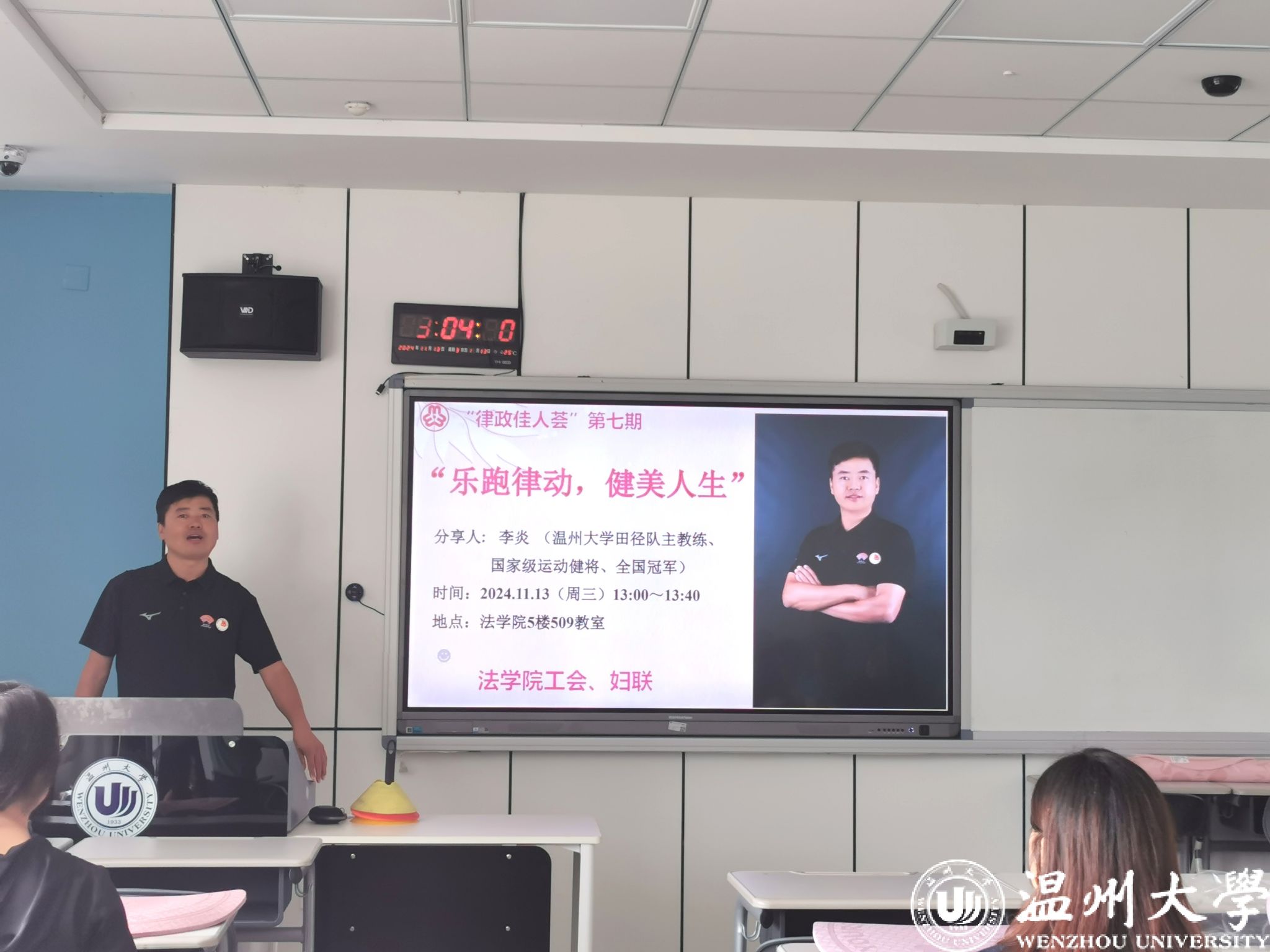 11月13日下午,av天堂 “律政佳人荟”第七期在2号楼509教室如期举行。本期活动的主题是“乐跑律动,健美人生”,邀请到av天堂 田径队主教练、国家级田径运动健将、全国长跑冠军李炎老师,带领老师们学习超慢跑和莱格尔跑,掌握科学的日常微运动。本次活动吸引了近30名教职工踊跃参与。