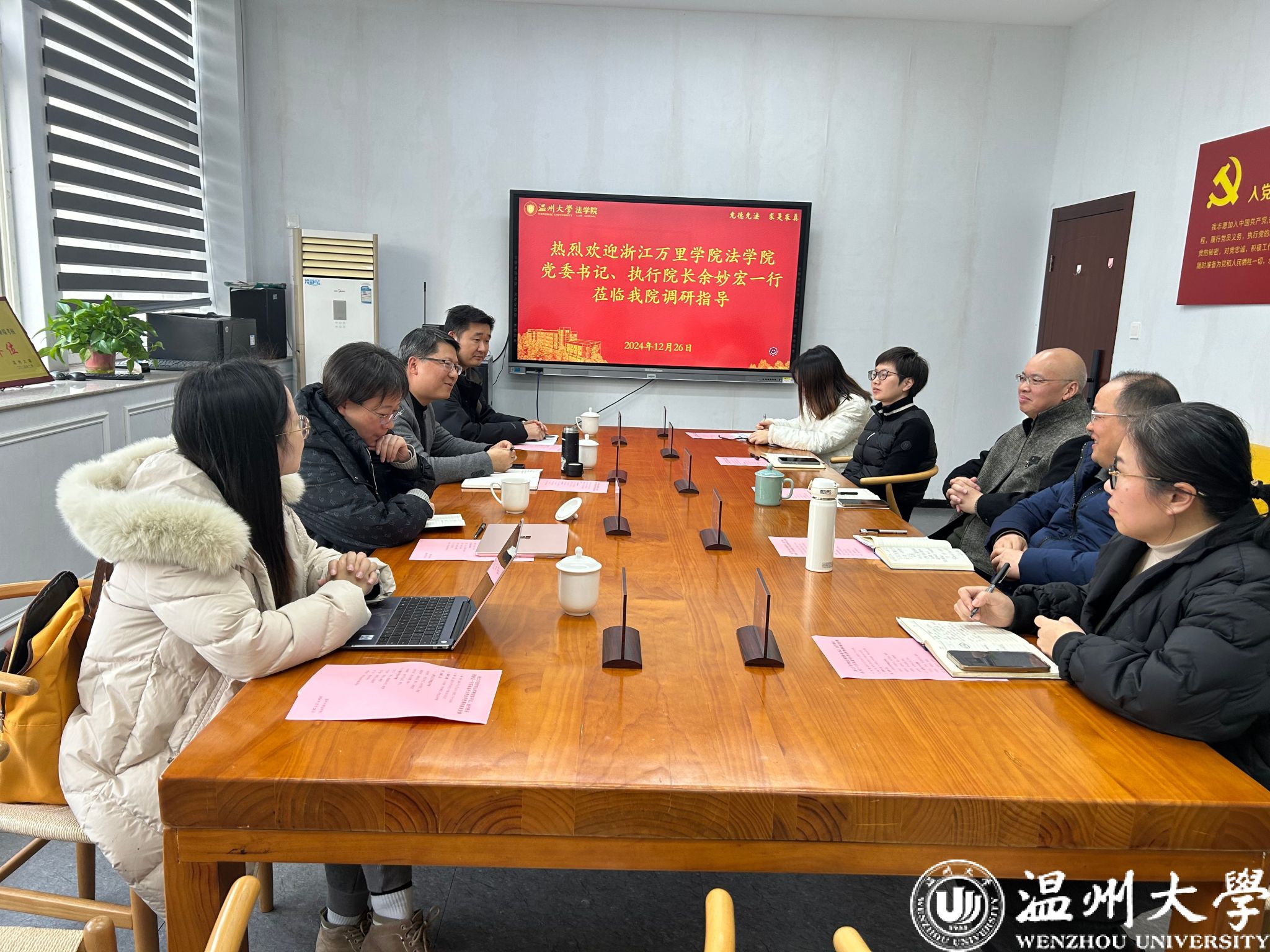 12月26日下午,浙江万里av天堂 av天堂 党委书记、执行院长余妙宏一行就人才培养、学科建设、研究生教育来我院调研交流。av天堂 院长、党委副书记王宗正、副院长叶肖华、副院长周一颜以及相关科室负责人参与座谈交流,座谈会由王宗正主持。