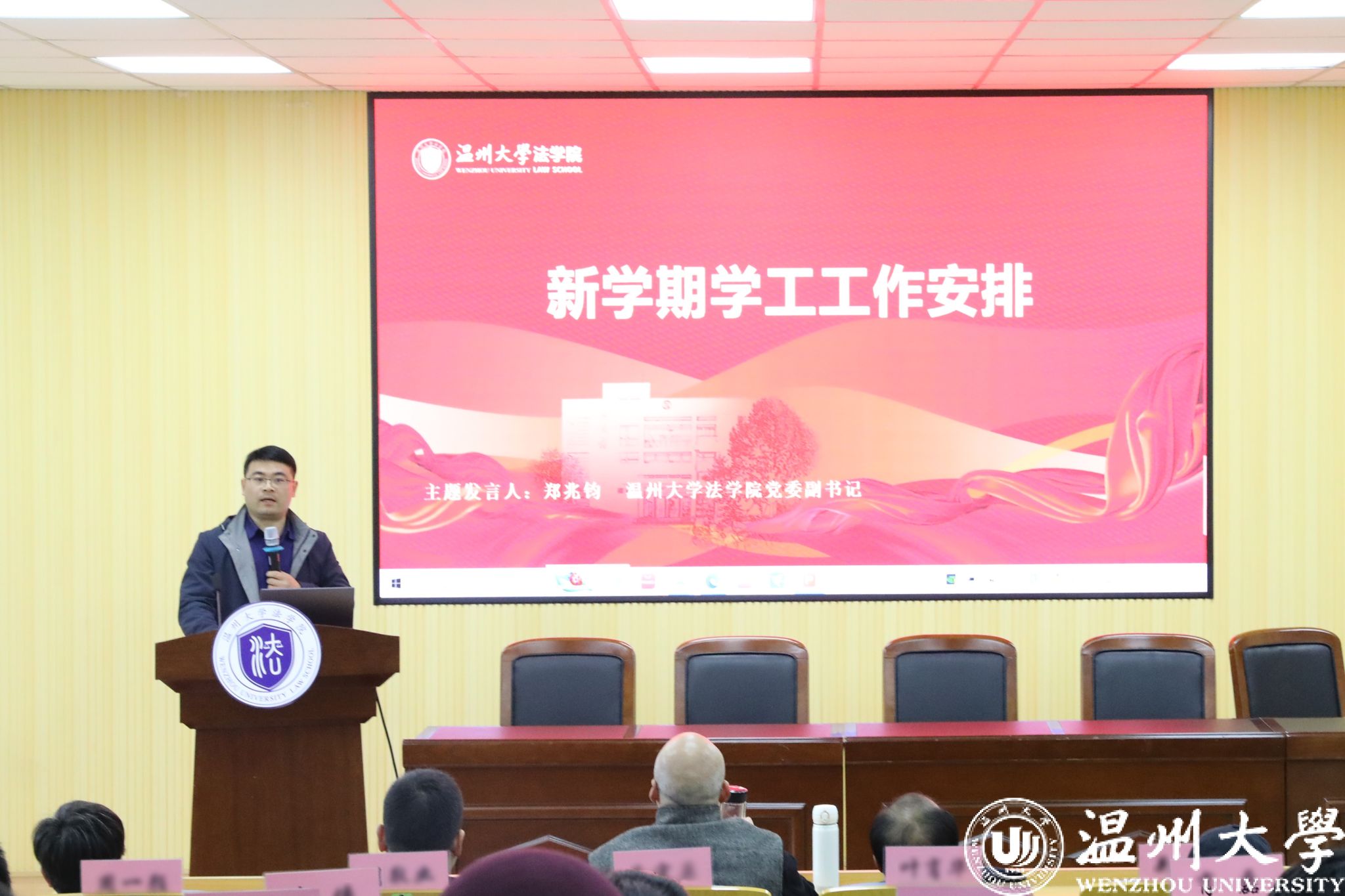 副院长周一颜从本科教育教学审核评估、教学常规、教学专项工作三方面部署新学期教学工作。她指出,要围绕审核评估中心工作,对标对点,补齐短板,提升本科教学质量;要对教学档案材料检查整改,根据教学制度文件修订增补,提升课堂教学质量;推进涉外法治人才协同培养,做好《国家安全教育》教学规范与课程改革等。
