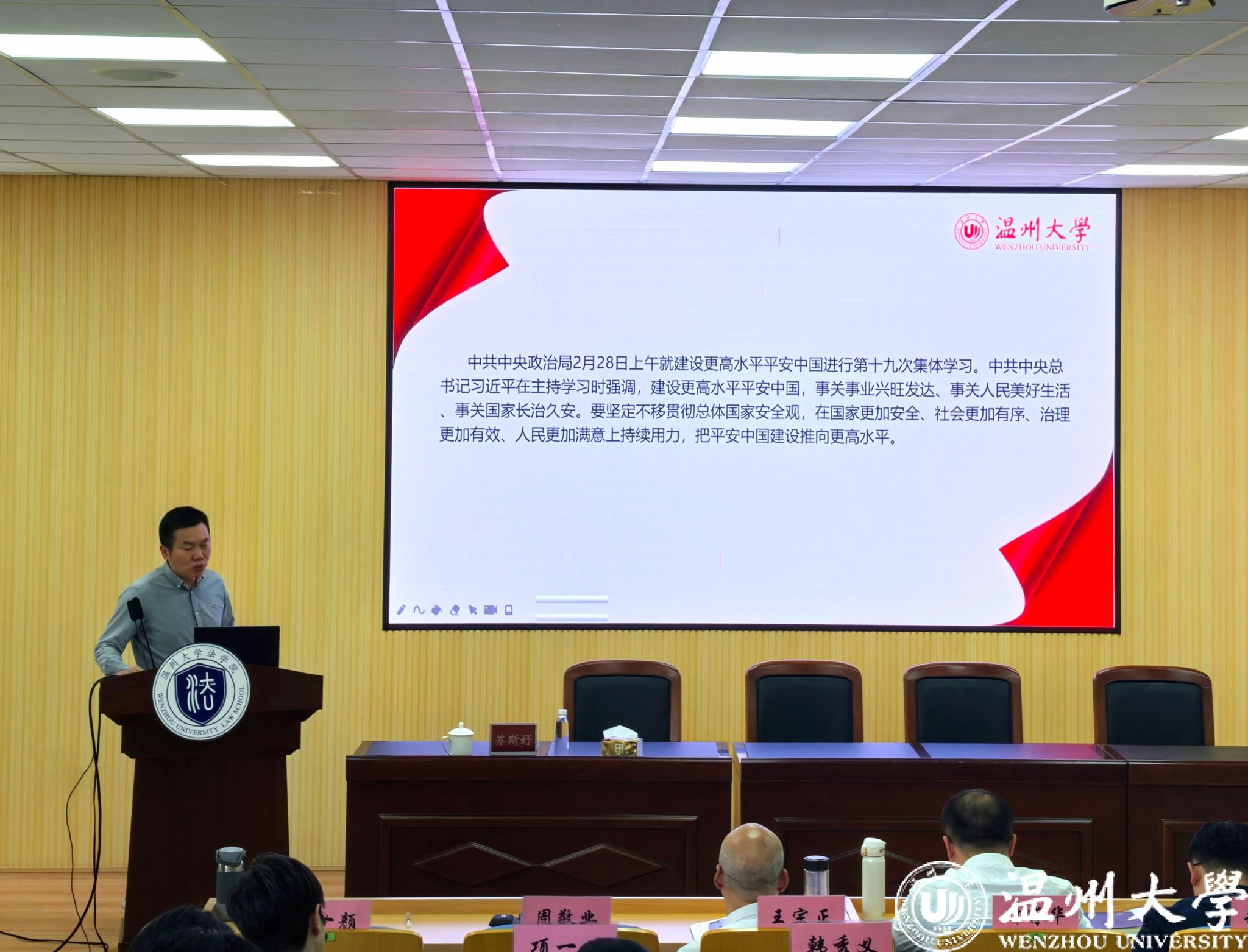 会上,周敬业书记带领大家学习《习近平总书记在中共中央政治局第十九次集体学习的重要讲话》。《讲话》指出,建设更高水平平安中国,事关事业兴旺发达、事关人民美好生活、事关国家长治久安。要坚定不移贯彻总体国家安全观,在国家更加安全、社会更加有序、治理更加有效、人民更加满意上持续用力,把平安中国建设推向更高水平。周书记要求全体教职工要深刻领会讲话精神的内涵和实质,将其贯彻到日常的教育教学和管理工作中。