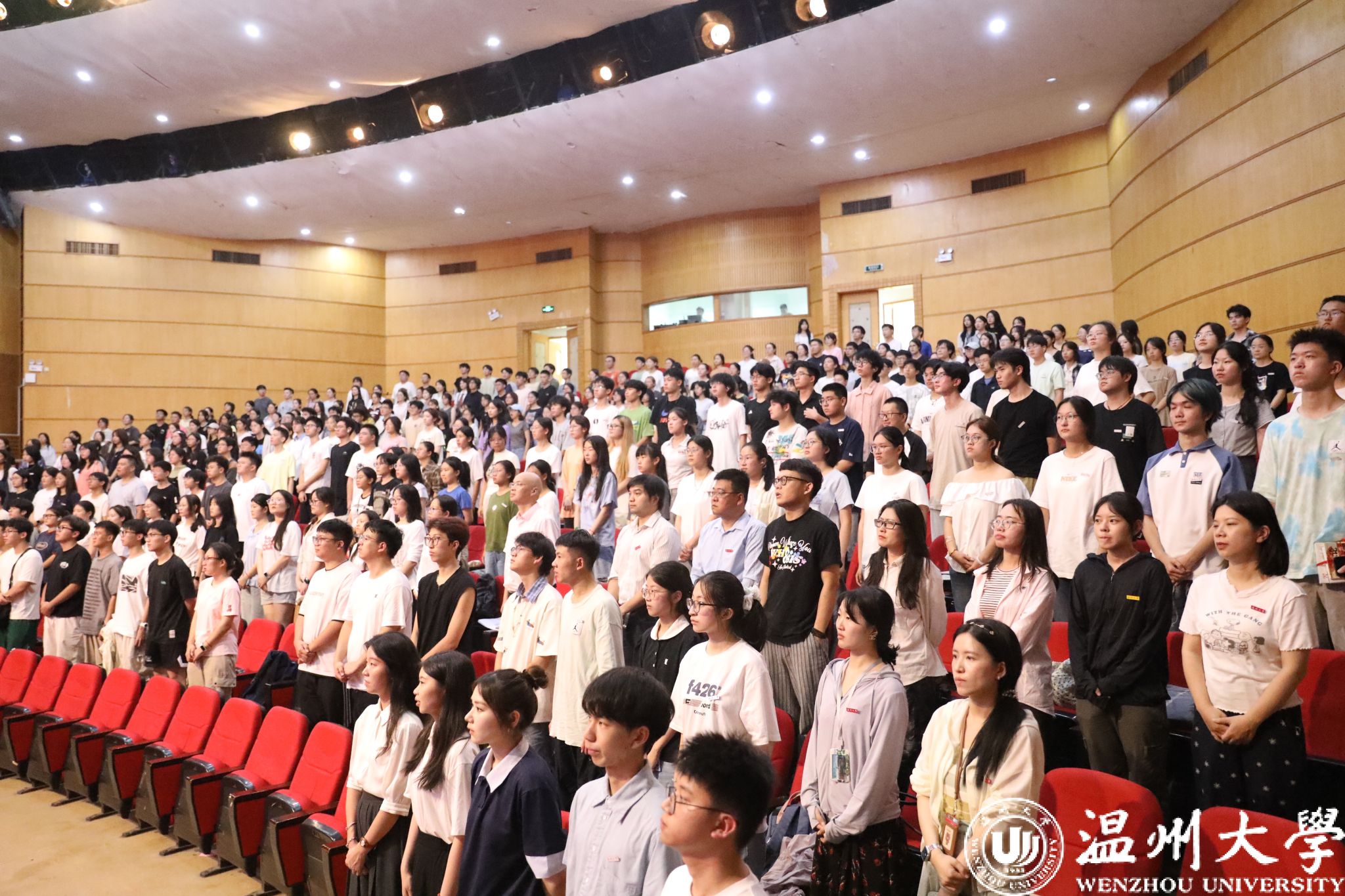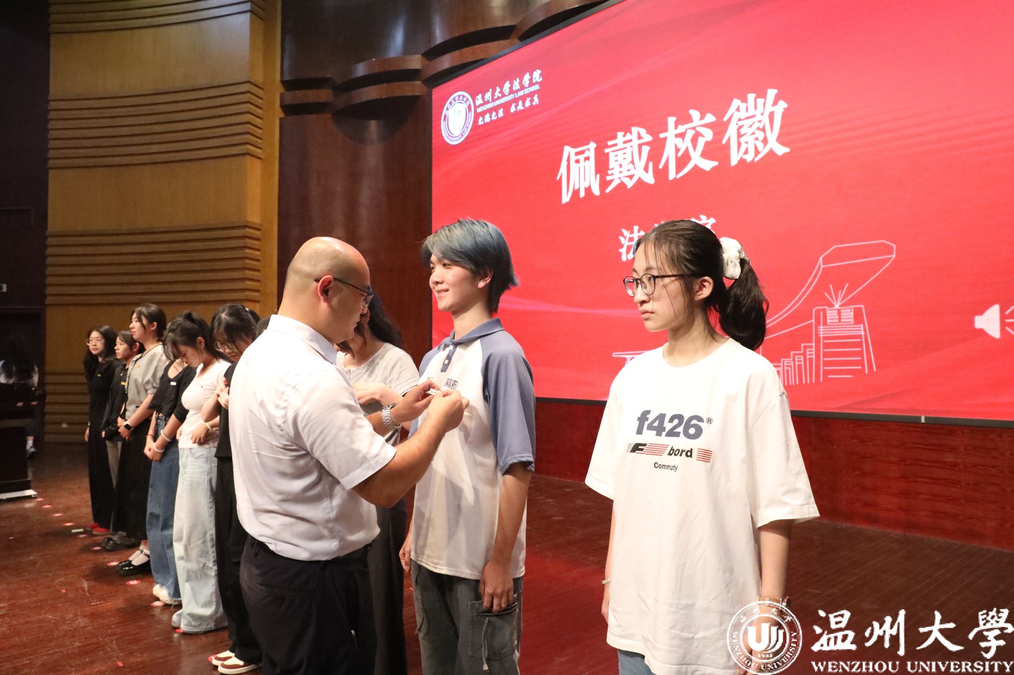 现场还举行了校徽佩戴仪式,党委副书记郑兆钧为新生代表逐一佩戴校徽,其他新生在现场同时佩戴校徽。这枚徽章不仅象征着同学们正式成为av天堂 的一员,更承载着“求学问是、敢为人先”的温大精神。从此刻起,他们将肩负起温大人的责任与使命,在这片沃土上书写属于自己的成长新篇。