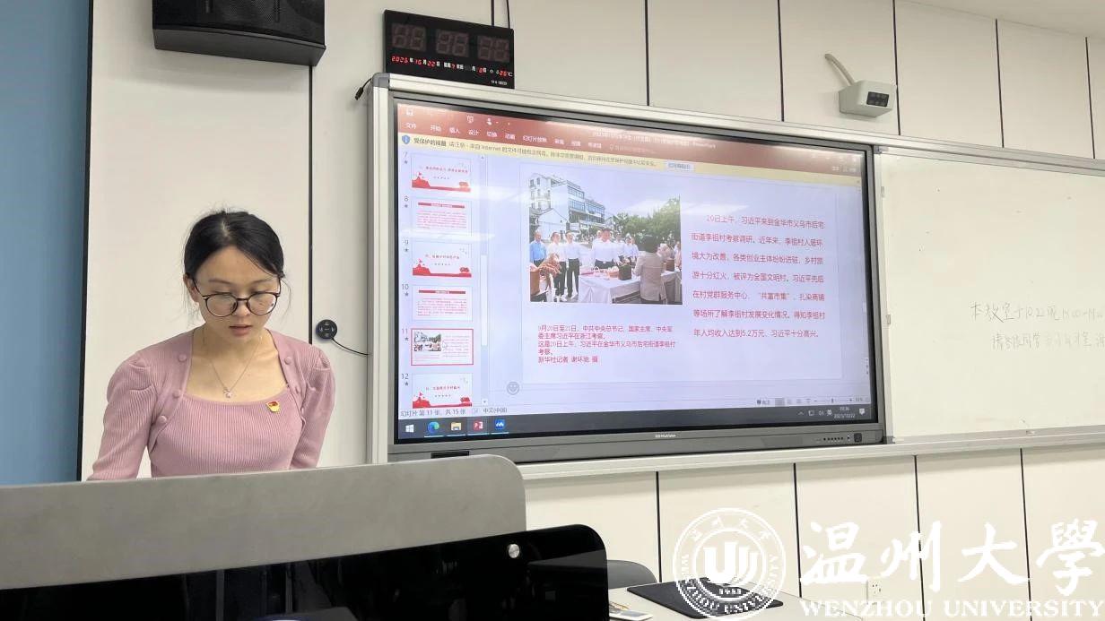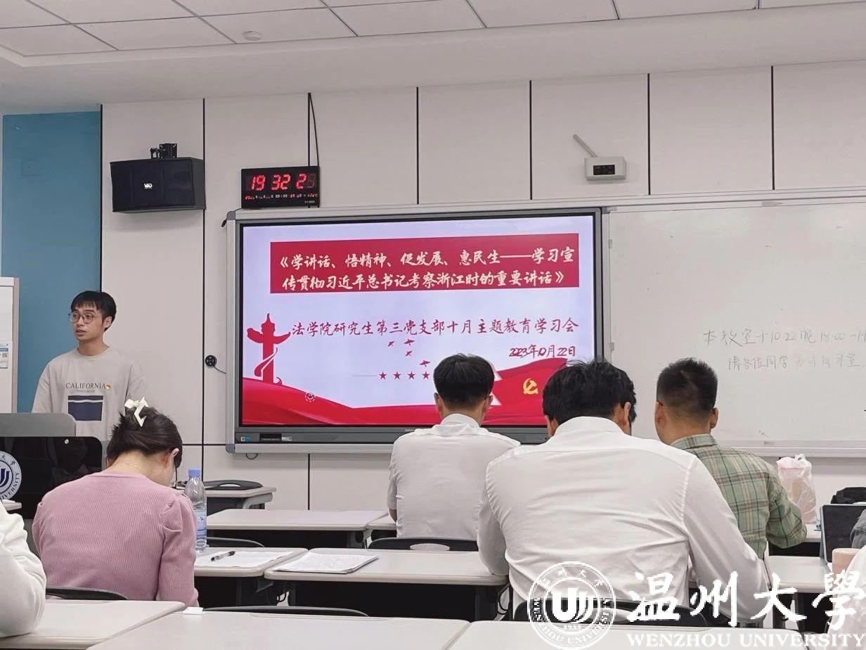 2023年10月22日晚,av天堂 研究生第三党支部开展了“学讲话、悟精神、促发展、惠民生”主题党日活动,重点学习宣传贯彻习近平总书记考察浙江时的重要讲话。付玉霞、蒋元旦、项娉娉、周心钰、袁一函、葛康怡、张怡轩、王冠梅杰、莫友同志分别就“杭州亚运会开幕前夕,习近平赴浙江考察”“习近平总书记为浙江省改革发展作出的系列重要指示”“学好用好《习近平经济思想学习纲要》”三个主题进行了学习心得分享。