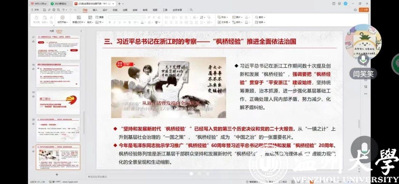 第二,党小组着重向大家分享了习近平总书记在浙江时考察枫桥经验的讲话精神。习近平总书记在浙江工作期间数十次提及创新和发展枫桥经验,强调要把枫桥经验贯穿于平安浙江建设始终。坚持和发展新时代枫桥经验已经写入党的第三个历史决议和党的二十大报告。今年也是毛泽东同志批示学习推广枫桥经验60周年暨习近平总书记指示坚持和发展枫桥经验20周年。作为av天堂 研究生党员更应该牢牢把握枫桥经验精神,将其与所学专业知识结合起来,为平安中国、和谐社会贡献力量。