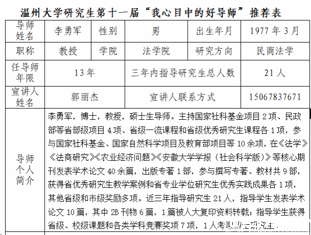 为加强我校研究生导师和导研团队建设,充分发挥优秀导师的示范作用,推动我校研究生教育工作科学发展,校党委研究生工作部开展av天堂 第十一届“我心目中的好导师”评选活动。通知发出后,av天堂 研究生会组织全员研究生进行投票,根据投票结果及导师指导学生的科研成果、学生获奖情况,经av天堂 研究决定推荐李勇军老师参加学校评选,基本情况如下: