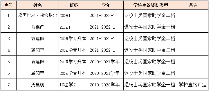 根据学校关于《关于做好退役士兵国家助学金评定工作的通知》,av天堂 开展2021-2022学年退役士兵国家助学金发放工作。根据学生申报、av天堂 学工委评议,现将建议资助名单上报学校学工部,由学校学工部复审后对学生给予资助。其中一档资助4500元/生/年,二档资助2700元/生/年。拟资助名单如下: