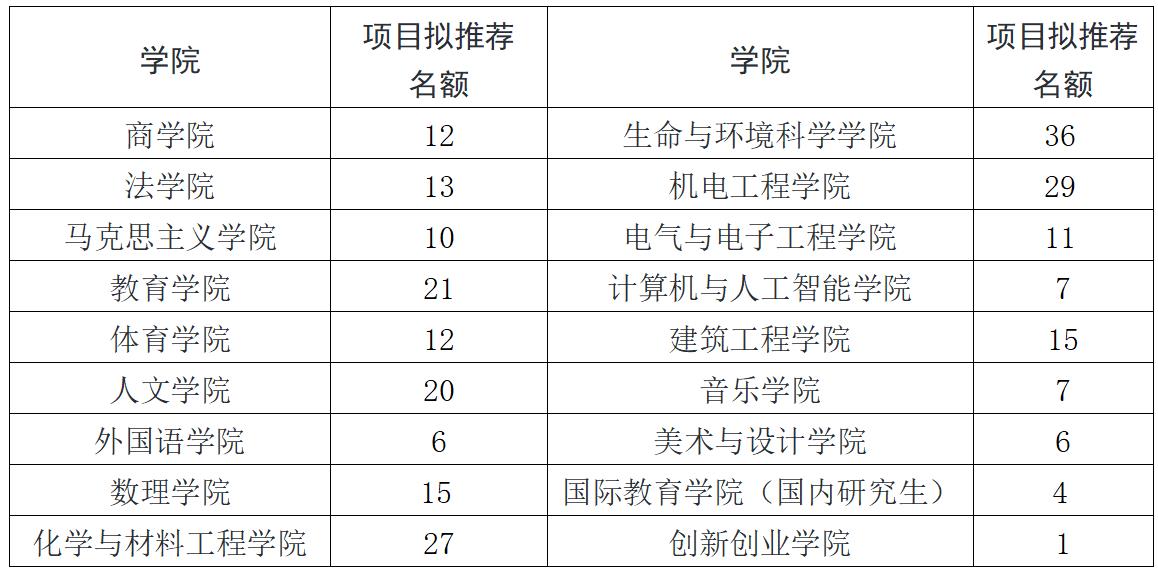 (一)各av天堂 可推荐硕士研究生创新基金项目数不超过在校研究生人数6%。各av天堂 可推荐参评名额(已核减未按期结题课题数)具体分配如下: