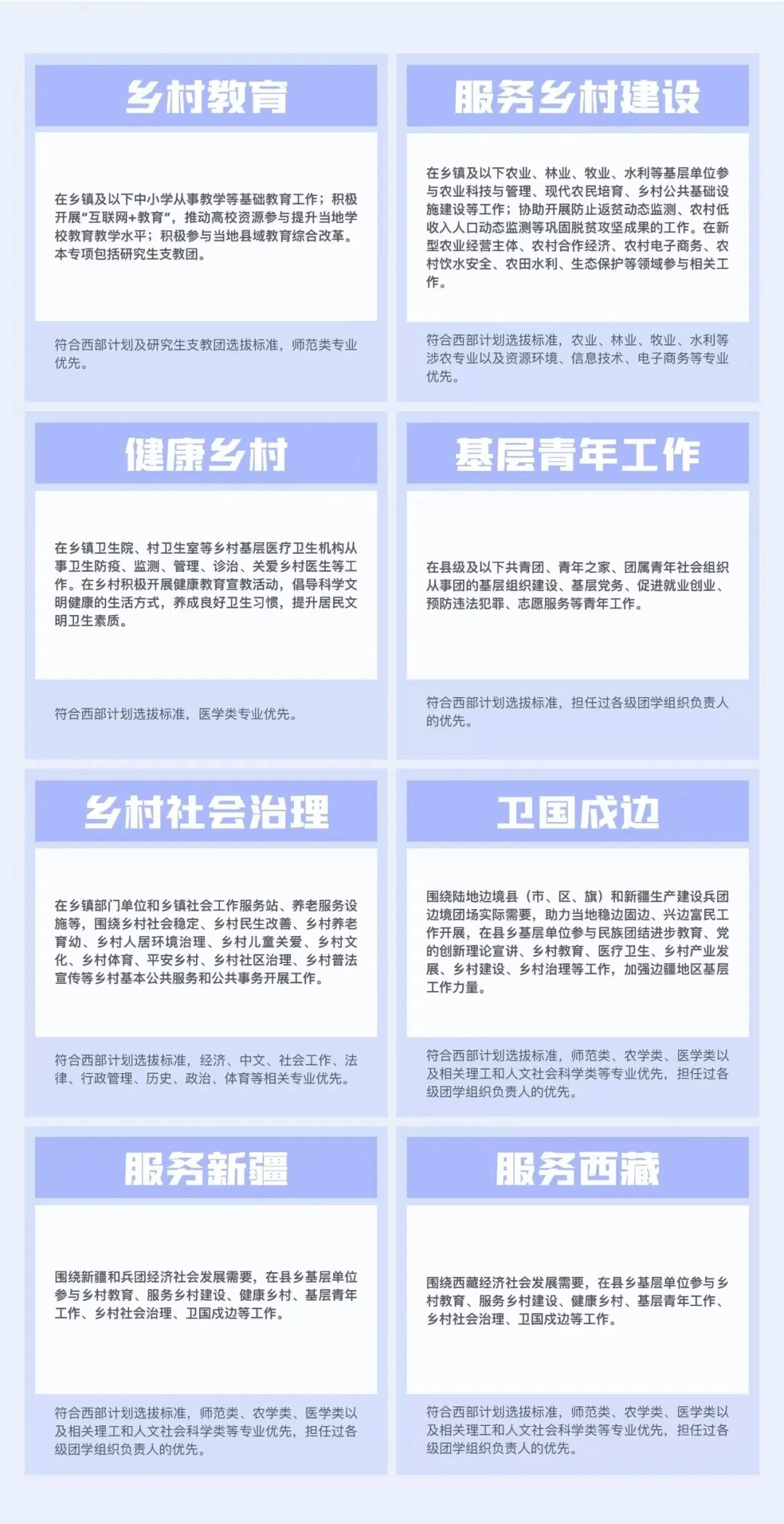 2025年大学生志愿服务西部计划报名通道已经开启。3月1日起,普通高等学校应届毕业生或在读研究生,可通过“西部志愿汇”微信公众号(菜单栏中的“我要报名”)或登录西部计划官方网站(//xibu.youth.cn),在西部计划报名系统中注册报名。温大同学可加入QQ群(见文末)进行咨询。