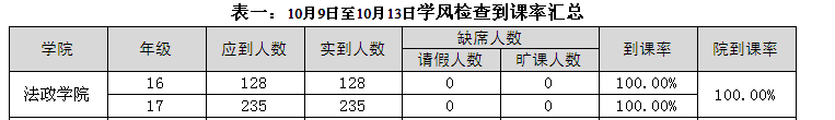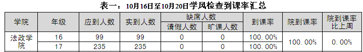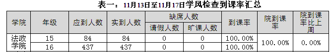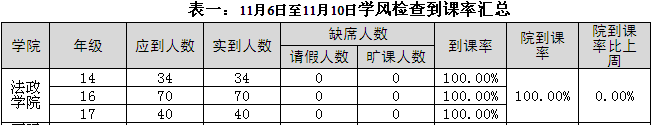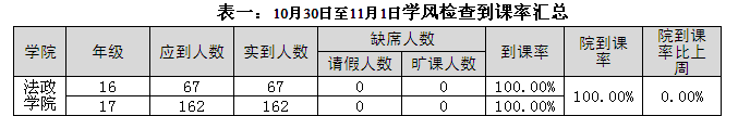 2017年11月6日至2017年11月10日,学生处组织人员对校本部110个班级的学生上课情况进行抽查。从抽查情况来看,学生上课秩序良好,上课教师普遍提前到达教室。法政av天堂 具体情况反映如下:
