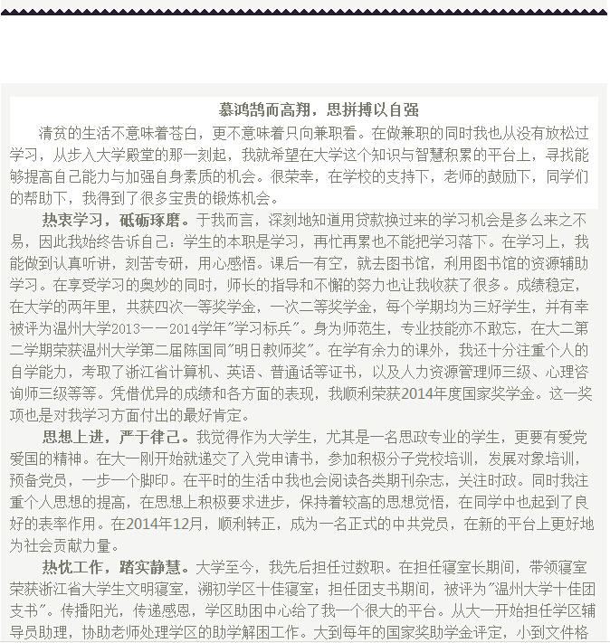 傅秀秀同学获奖感言:无论你信或者不信,我首先想说是:能作为法政的一员,真的很幸福。老师的谆谆教导,同学的互帮互助,学长学姐的经验指导,学弟学妹的鼓励支持,一切的一切,都是那么的温暖,那么的让人感动!在每一个困惑的路口,在每一个想要放弃的瞬间,总能得到一份支持,让你充满力量继续前行。对于这些,一方面我们要心怀感恩,感谢那些为我们呐喊和鼓掌的人;另一方面,我们更要提高对自我的要求,明确自己的目标,坚定自己的梦想,在前行的道路上勇往直前。三句话与大家一起共勉:1.不怕自己不够优秀,就怕比你还优秀的人比你更努力;2.你所认为的极限,可能只是别人的起点;3.于这个世界,我们来过,但不仅仅是来过。