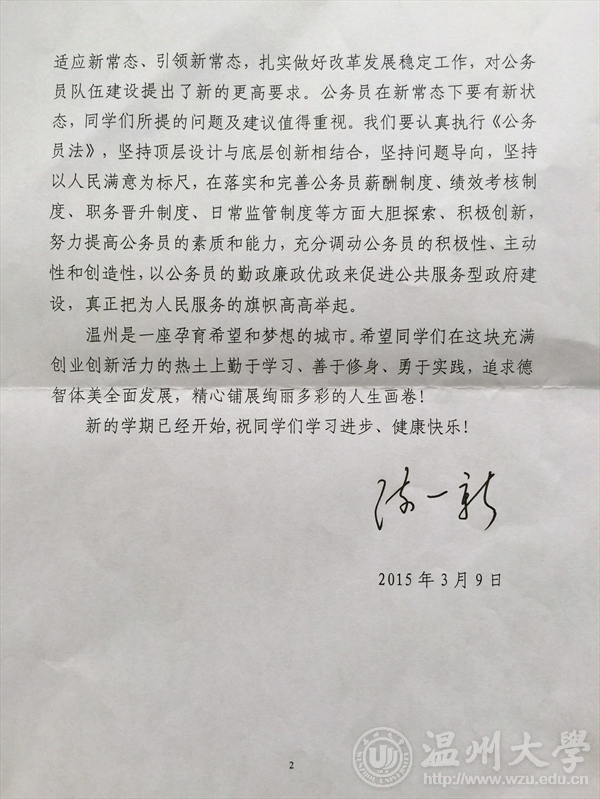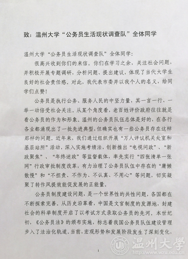 我院学生用近半年的时间对我市"公务员生活现状"做了深入的调研,并就此事给省委常委、市委书记陈一新写了一封信。