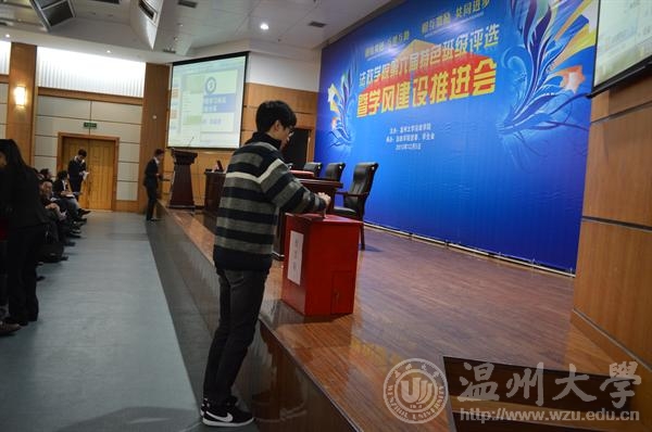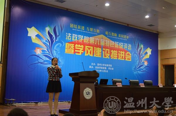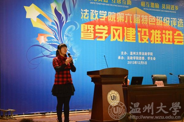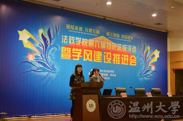 参加此次特色班评选活动的6个班级代表依次上台通过幻灯片展示本班在学风建设、党团建设、素质拓展以及科技创新等方面的建设情况,展示中每个班级各有特色,但也不乏共同成绩:班集体凝聚力强、和谐稳定,学风严谨,学习气氛浓厚,学习成绩优良。各班级的精美幻灯片展示和精彩陈述让台下观摩的师生掌声不断。最后,钭晓东院长宣布经280位师生现场投票,根据得票数高低,11行管、12政本、12法一、11政本、11法二5个班级最终胜出获选法政av天堂 第六届特色班级荣誉称号。院领导钭晓东、王柏民、王宗正、严玲红向获奖班级颁发荣誉证书和班级建设奖金。计票环节,av天堂 获选校学习标兵的郑盛霞和金娅莉同学还分别介绍了自己的学习方法和心得体会。