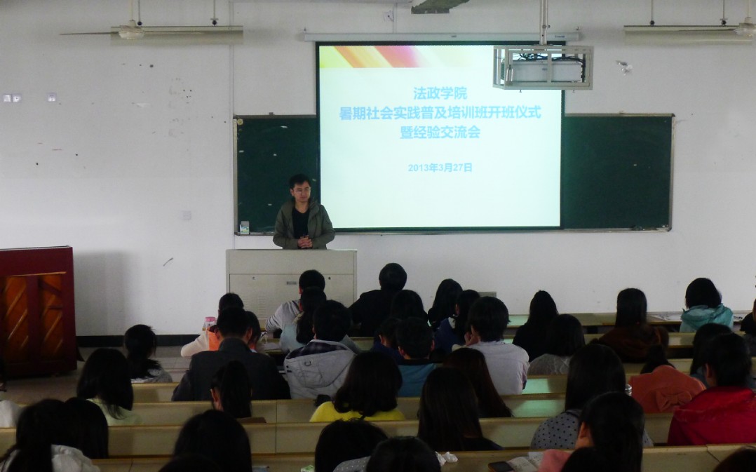 2013年3月27日下午,法政av天堂 暑期社会实践普及培训班开班仪式暨经验交流会在法政楼203室准时举行。法政av天堂 辅导员白昌科老师出席活动,2012年法政av天堂 两支优秀实践队的队长分别进行了活动情况展示和经验分享。