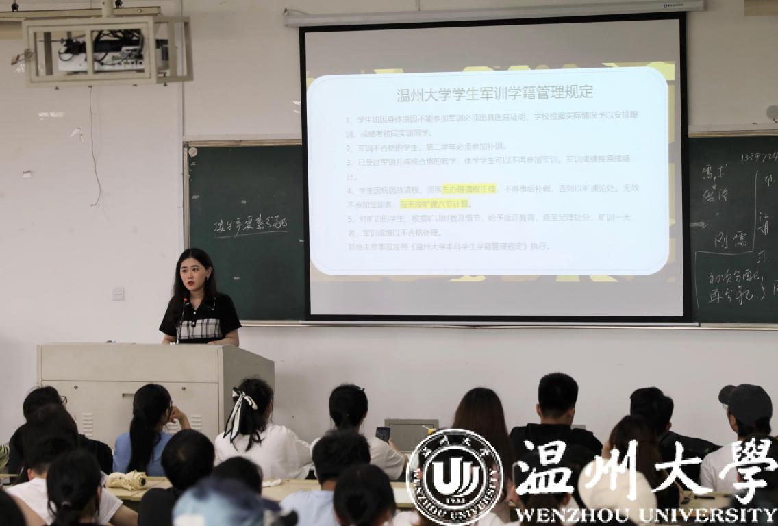 随后,黄老师详细介绍了军训时各班所属的连队、军训纪律规定、军训学籍管理规定、军训联队竞赛办法、军训作息安排、安全工作以及卫生保健相关知识,细心提醒同学们合理安排饮食,防中暑、防感冒、防外伤,做到五个“不宜”:剧烈运动刚一结束,不宜立即停下来休息;不宜立即大量饮水;不宜马上洗冷水澡、吹电风扇或进空调房间;不宜立即吃冷饮;不宜立即吃饭。最后,黄老师表达了她对同学们的美好祝愿,希望同学们可以在此次军训中有所收获、有所进步,圆满顺利地完成军训任务,动员大会在同学们热烈的掌声中落下帷幕。