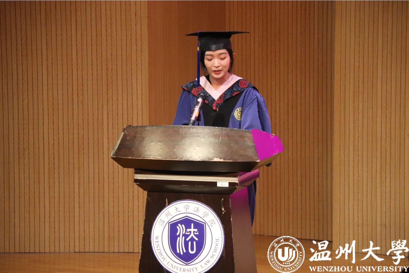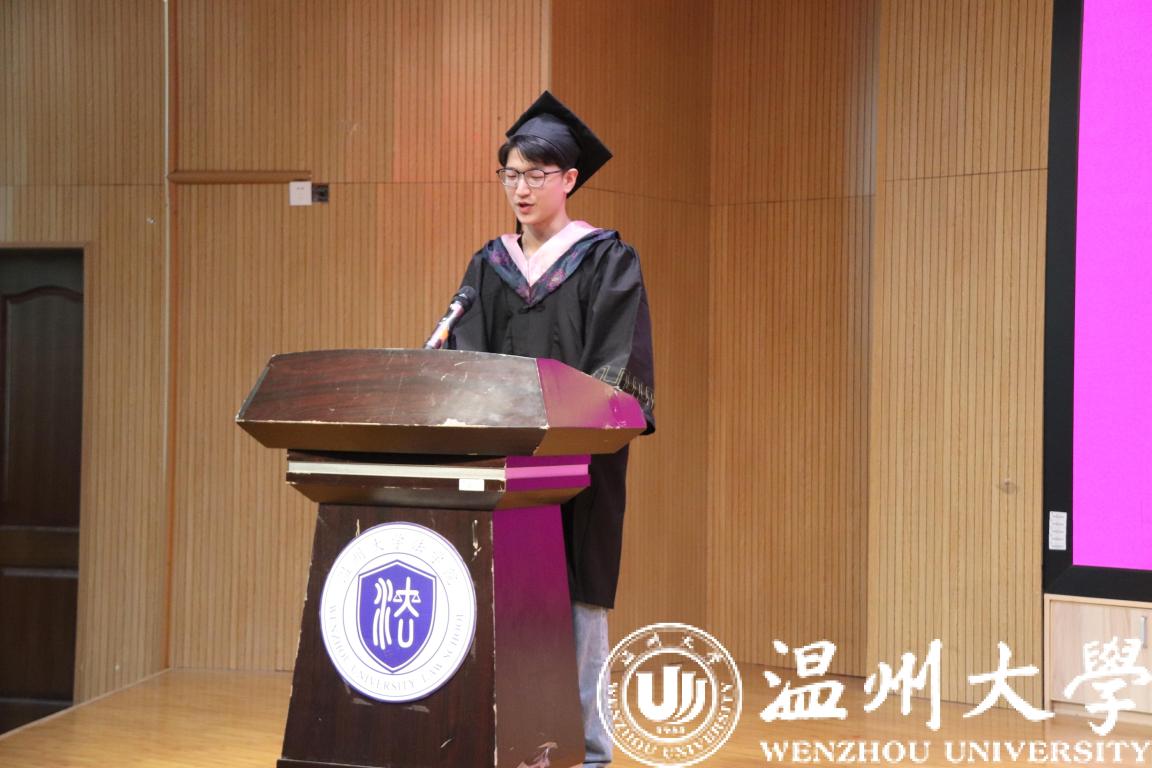 留学生代表Abdallah Usama Ibrahim 发言,他分享了四年的收获与成长,表达了对师长悉心培养的感谢,对母校的不舍与感恩。留学生活让他们学会了运用汉语,学到了他们热爱的法学专业知识,当学业圆满完成的时刻,最想表达的、也溢于言表的就是对母校教育、对温州、对中国的由衷感谢。“We are indebted to each other. The friendships that we have made here will last a lifetime.”