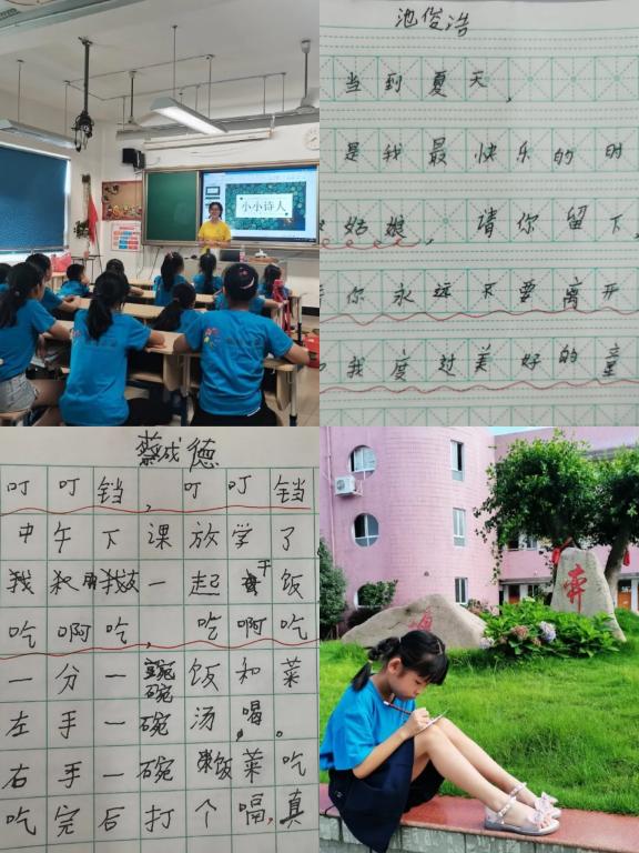 蔚蓝天空中飘过的云,野雏菊花朵上停留的菜花蝶,操场上快意自由的风……在石椅上、在花坛边,侨宝们铺开一张张信纸,把观察的景物写成一首首专属于童年的诗。“老师,我可以写风吗?”“老师,我可以写夏天吗?”当然可以。只要细心观察,任何事物都能成诗。
