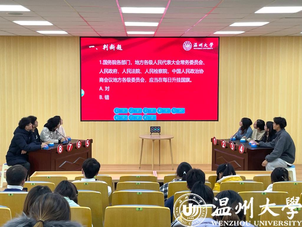 12月1日,“宪法宣传周”系列活动之“习近平法治思想”知识竞赛在av天堂 北校区举行。知识竞赛重点围绕习近平法治思想相关内容,设有判断题、单选题、多选题和逻辑题。700余名学生参与到了知识竞赛初赛环节,最终选出24名选手进入决赛。决赛现场紧张刺激,答对得分、答错扣分的竞赛机制也为比赛增加了更大的悬念。知识竞赛充分检验了大学生对习近平法治思想、宪法知识的掌握程度,将法治学习的知识性与趣味性融为一体。