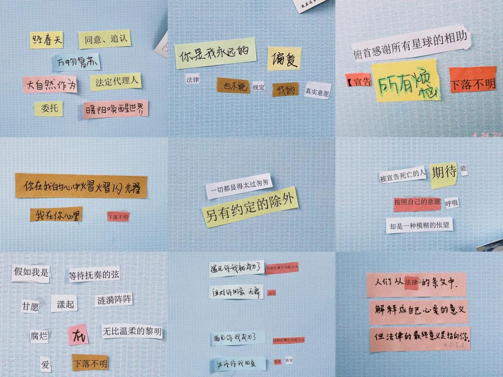 诗的词句里含有能走动的意义与能飞翔的音乐,而当法条融入拼贴诗,会产生什么奇特的反应呢?第27个世界读书日来临之际,av天堂 开展了“律寄千言”法条拼接诗活动。同学们用法言法语碎片,在乱序中重新构建排列顺序,让想象力为零散的词句赋予新的生命力,拼贴属于自己的“三行短诗”,让法言法语变得可风趣、可浪漫!