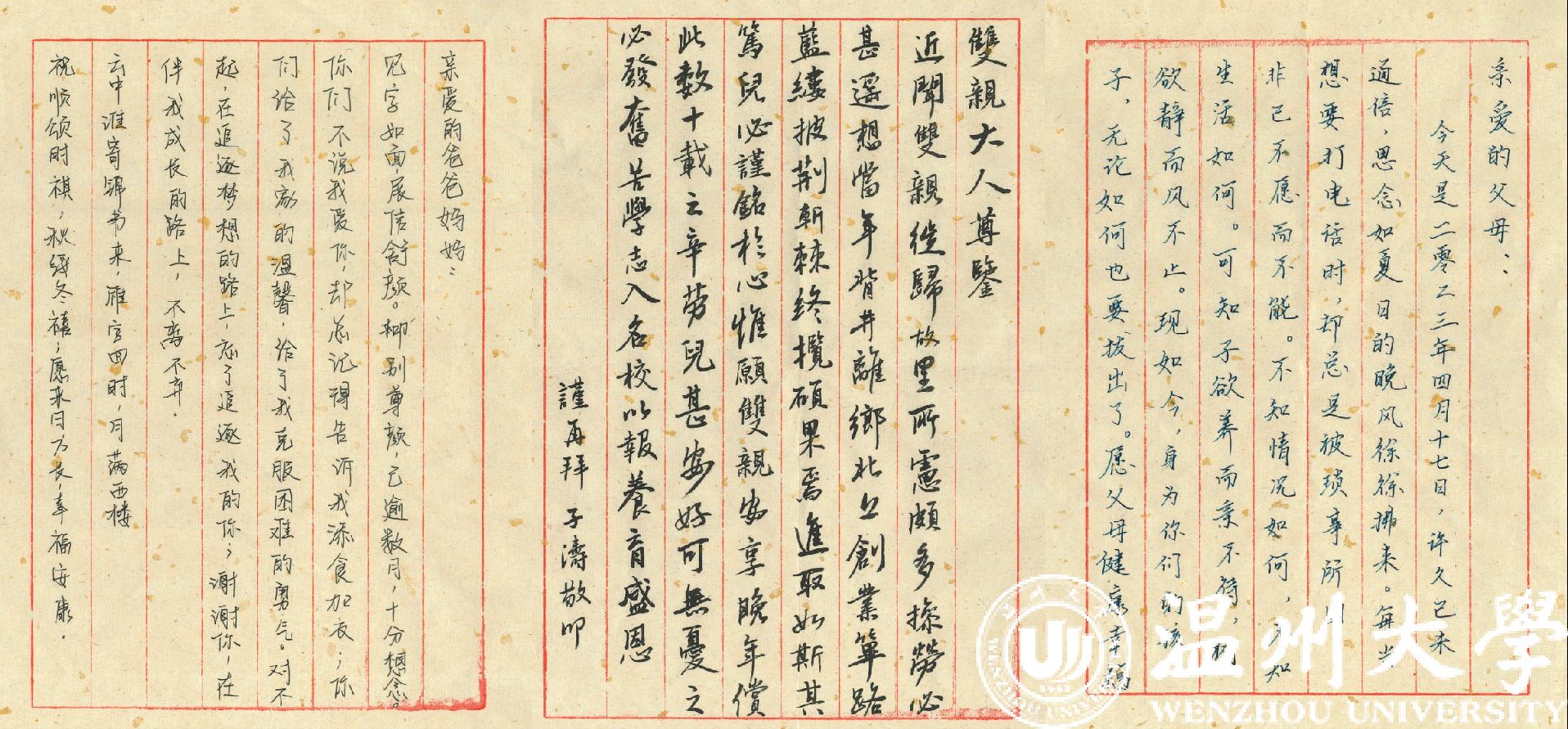 为深入贯彻落实习近平总书记关于注重家庭家教家风建设的重要论述,充分挖掘家书家信在培养道德情操、促进家庭和谐中蕴含的文化价值、道德价值和社会价值,赓续“百善孝为先”的美德,第二十八个世界读书日来临之际,av天堂 组织开展了“七步立法秉肃穆,三行家书传温情”优秀家书征集活动。德为律核,以书做舟,以信化径,挥墨家书,希冀莘莘学子敞开心扉,与家人畅所欲言。同学们踊跃参加,积极投稿,用笔墨抒写那些与家人之间道不尽的真情及感动......