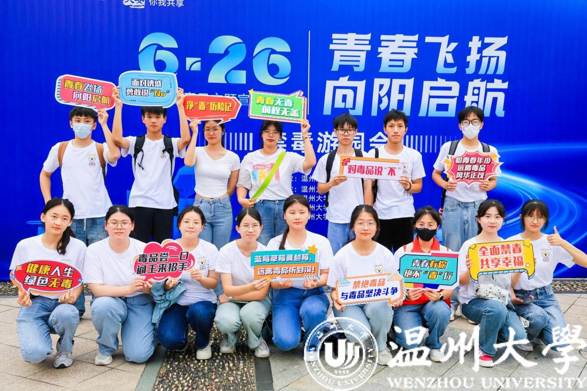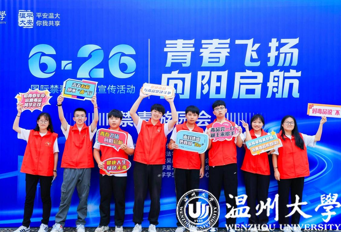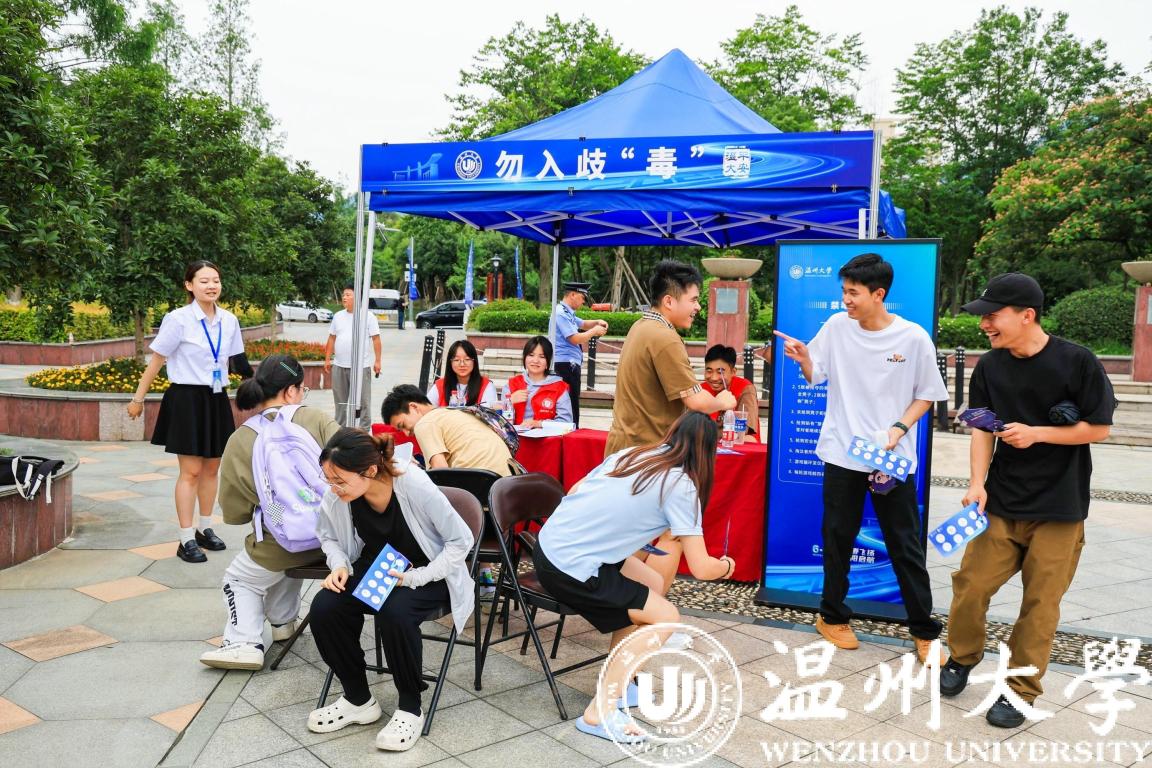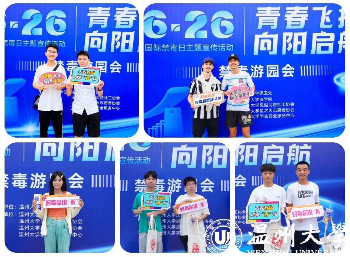 为全面营造全民禁毒宣传月活动氛围,助推温州市“全国禁毒示范城市”创建工作,进一步增强在校学生识毒、防毒、拒毒、禁毒意识,在第36个“6·26”国际禁毒日来临之际,av天堂 保卫处联合av天堂 开展“青春飞扬,向阳启航”——禁毒主题游园会,活动吸引了温州各大高校学生广泛参与。