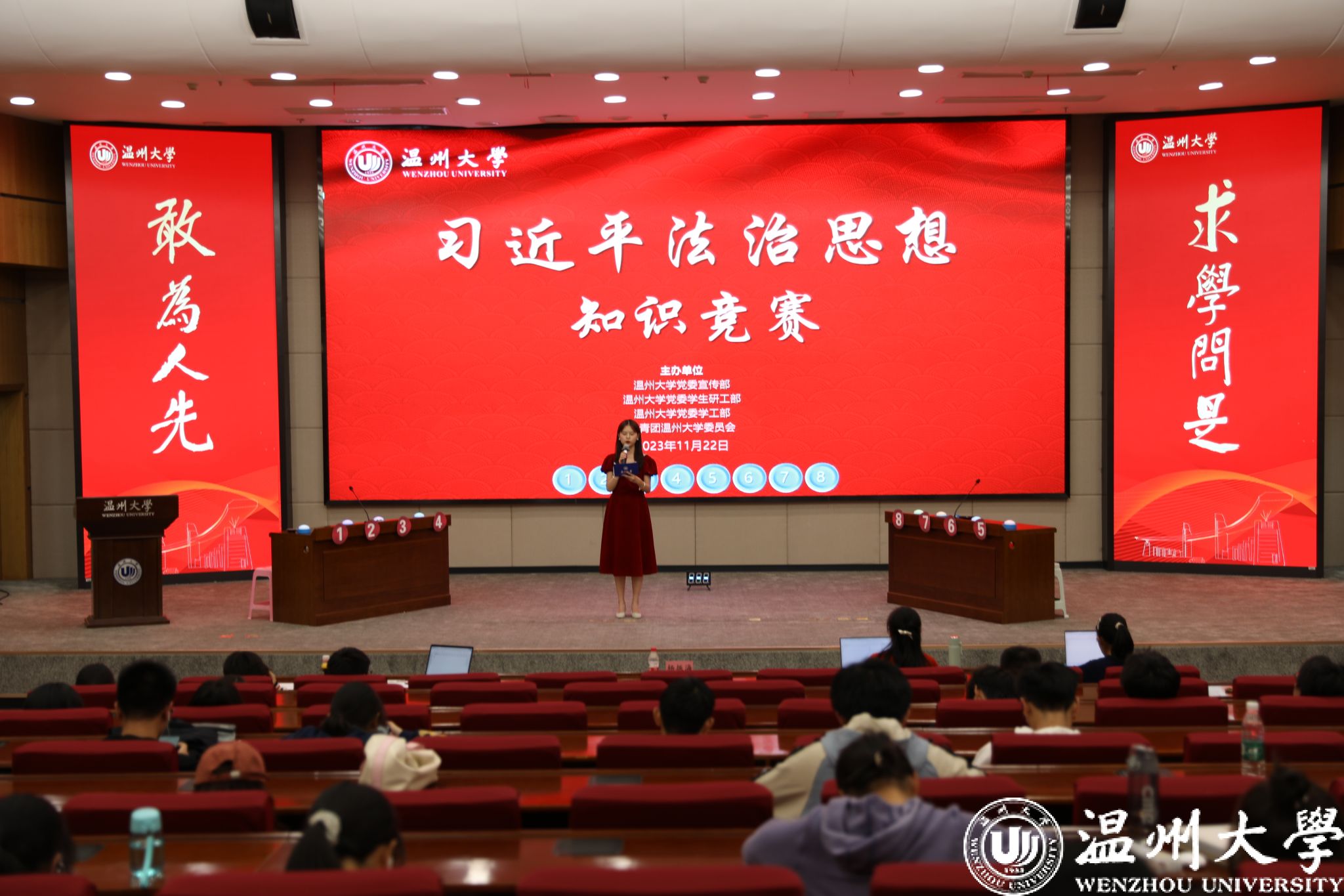 习近平法治思想知识竞赛自预热宣传时期就受到同学们的广泛关注,来自全校各个av天堂 的同学们共同掀起了一场学习习近平法治思想的热潮,来自各个av天堂 近350余名同学参加了知识竞赛初赛。经过初赛的交锋,24名同学脱颖而出,于11月22日在育英图书馆二楼报告厅展开终极对决。