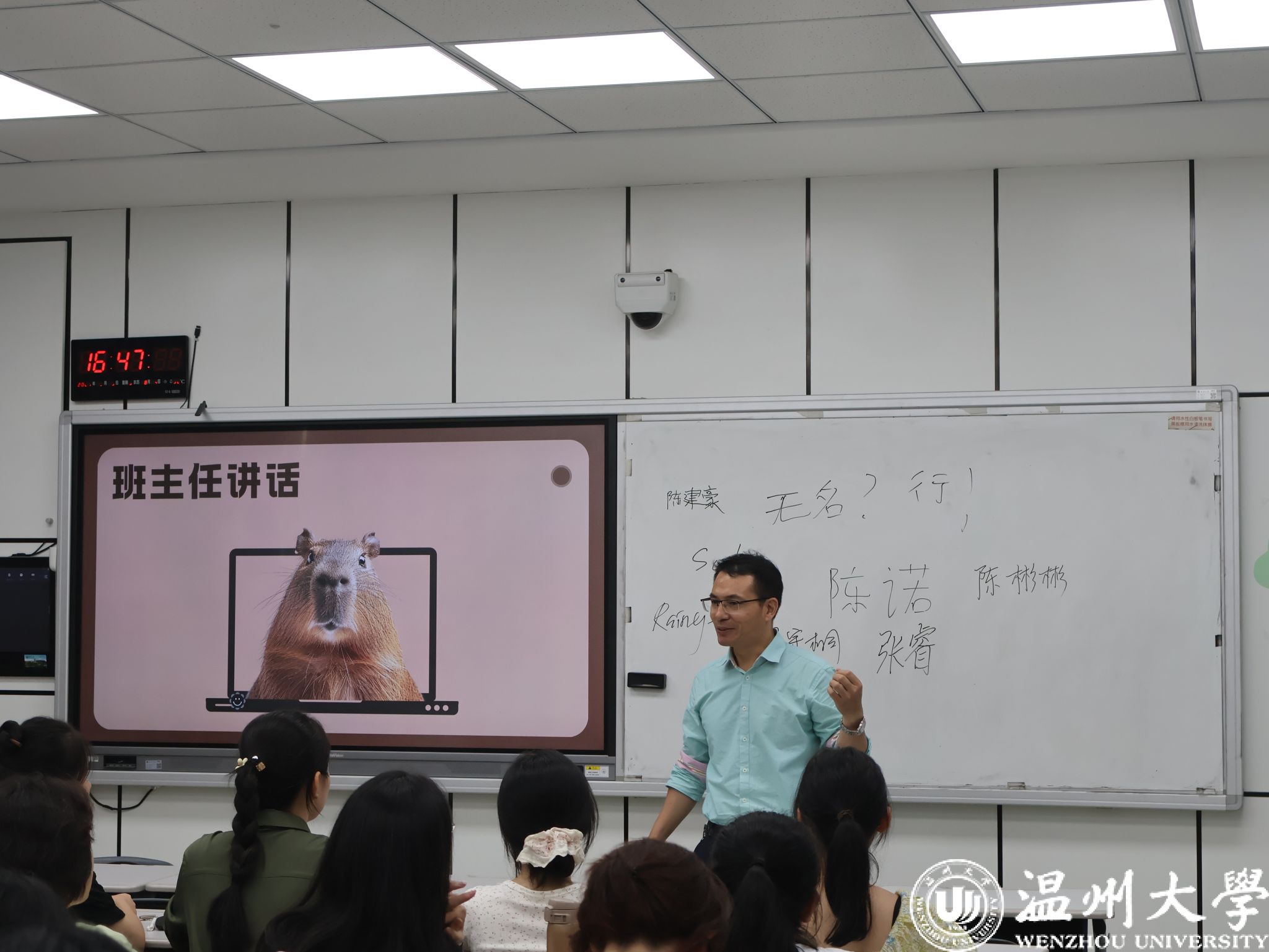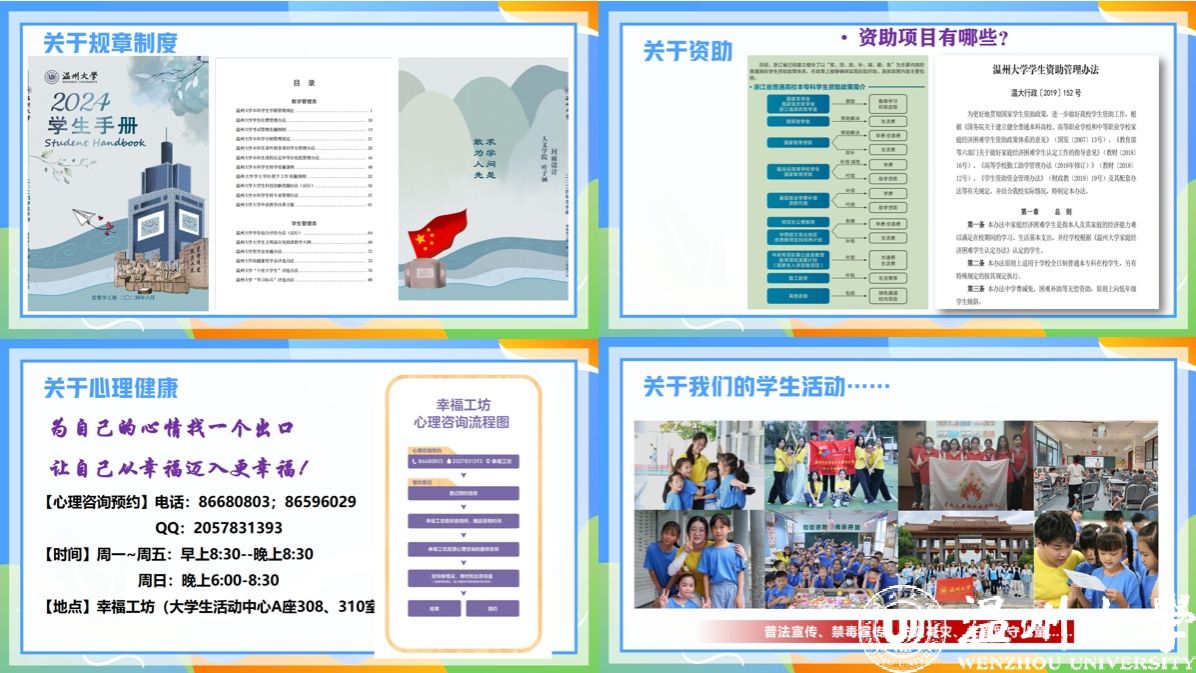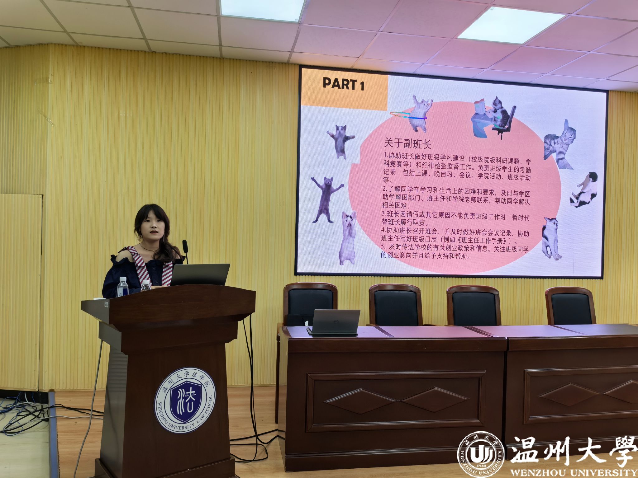 黄老师以“跨越山海 聚梦温大”为主题切入,对新同学们的到来表示热烈的欢迎与殷切的期待,向同学们介绍了新学期与新生相关的重点工作以及av天堂 科室设置、辅导员责任分工等。鼓励大家端正心态、调整情绪,调整生物钟、逐渐步入正轨,结合实际、制定学习计划,积极参加体育运动。通过“悟长、悟志、悟才、悟行”,看到自己的成长、找到自己的目标、发挥自己的技能、走好新学期之路。