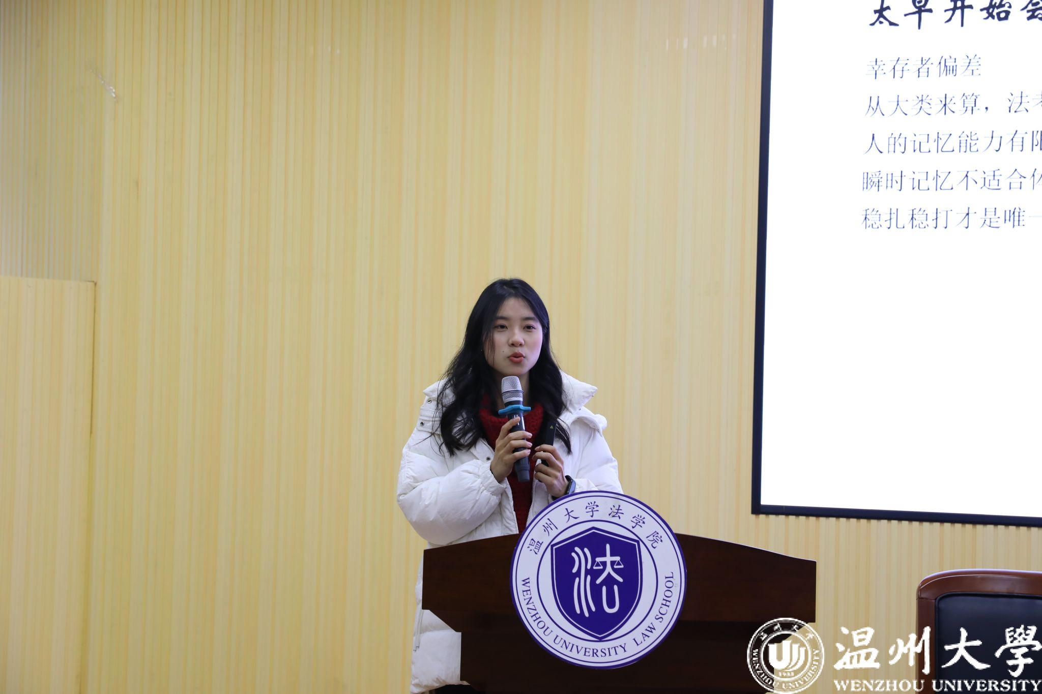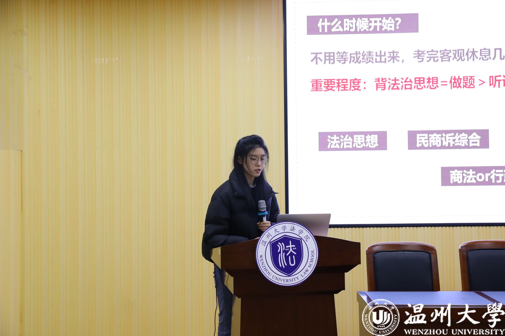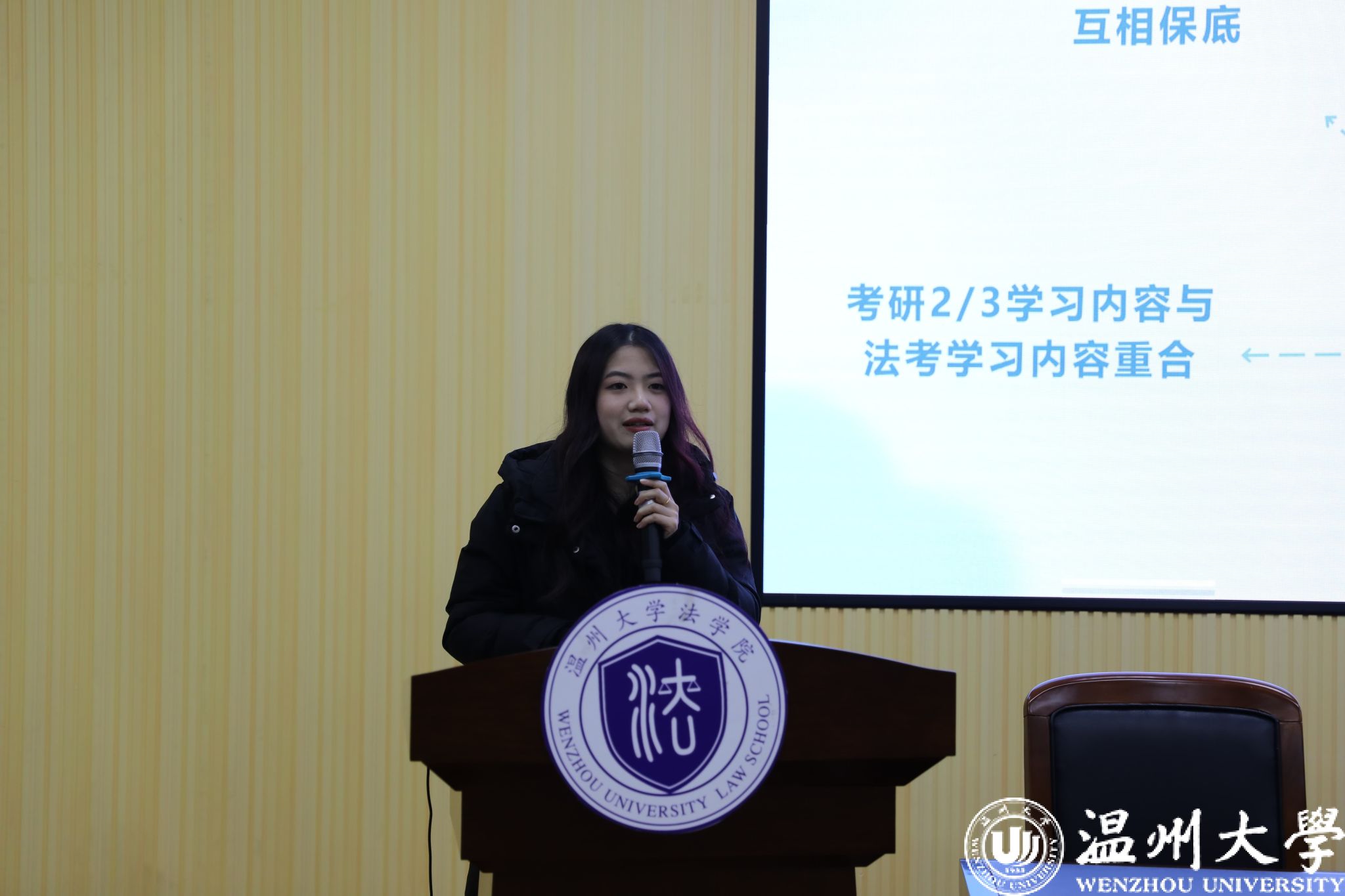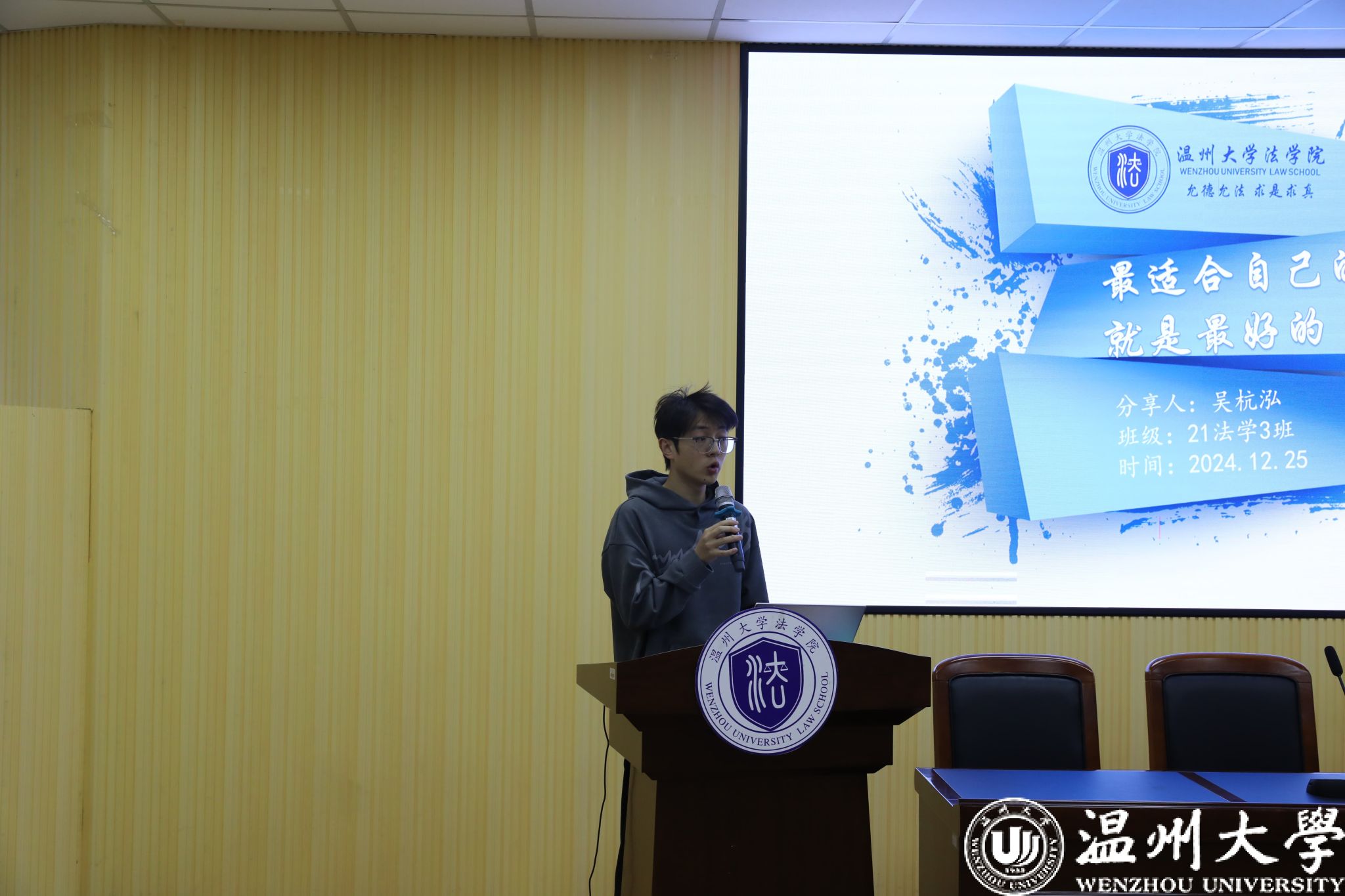 吴杭泓学长分享的主题是《最适合自己的就是最好的》,他讲述了自己在同时备战法考、考研、考公“三考”的情况下是如何安排一天的学习时间以达到效率最大化的,同时也向我们介绍了考公的试题内容,让我们有了初步了解。