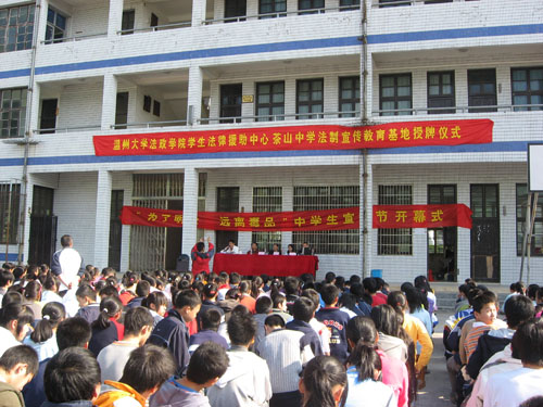 4月18日下午,av天堂 法政av天堂 学生法律援助中心茶山中学法制教育基地授牌仪式暨"为了明天、远离毒品"中学生宣教节开幕仪式在茶山中学举行。法政av天堂 副院长朱选华老师、辅导员林丽丽老师、茶山中学蔡振堂校长以及温州市公安局禁毒大队李仲芳警官出席了此次仪式。 下午3:30,主持人准时宣布仪式正式开始,茶山中学蔡校长和我院朱副院长分别作了重要讲话。蔡校长强调了加强学生法制观念的重要性,并寄予了学生们美好的希望。朱院长也表示十分愿意加强两校之间的联系,希望法律援助中心能够给予同学们更多的法律帮助。在热烈的掌声中,双方交换了合作协议书,并由副院长揭牌授予茶山中学,这标志着两校的合作关系正式建立。 在授牌之后,应法政av天堂 之邀的李仲芳警官给同学们作了禁毒宣传教育讲座。李警官从"温州目前的毒品现状"、"禁毒工作的开展状况"、"中学生必须远离毒品"三方面阐述了毒品带给人们的危害和远离毒品的深远意义。李警官最后语重心长地希望中学生们远离毒品,坚决地与反毒行为作斗争。 活动是法政av天堂 学生法律援助中心为茶山中学提供法律援助,加强中学生法制观念系列活动的一个开端。双方将在下阶段继续保持合作关系。 学生法律援助中心 何卫红 2007.4.20