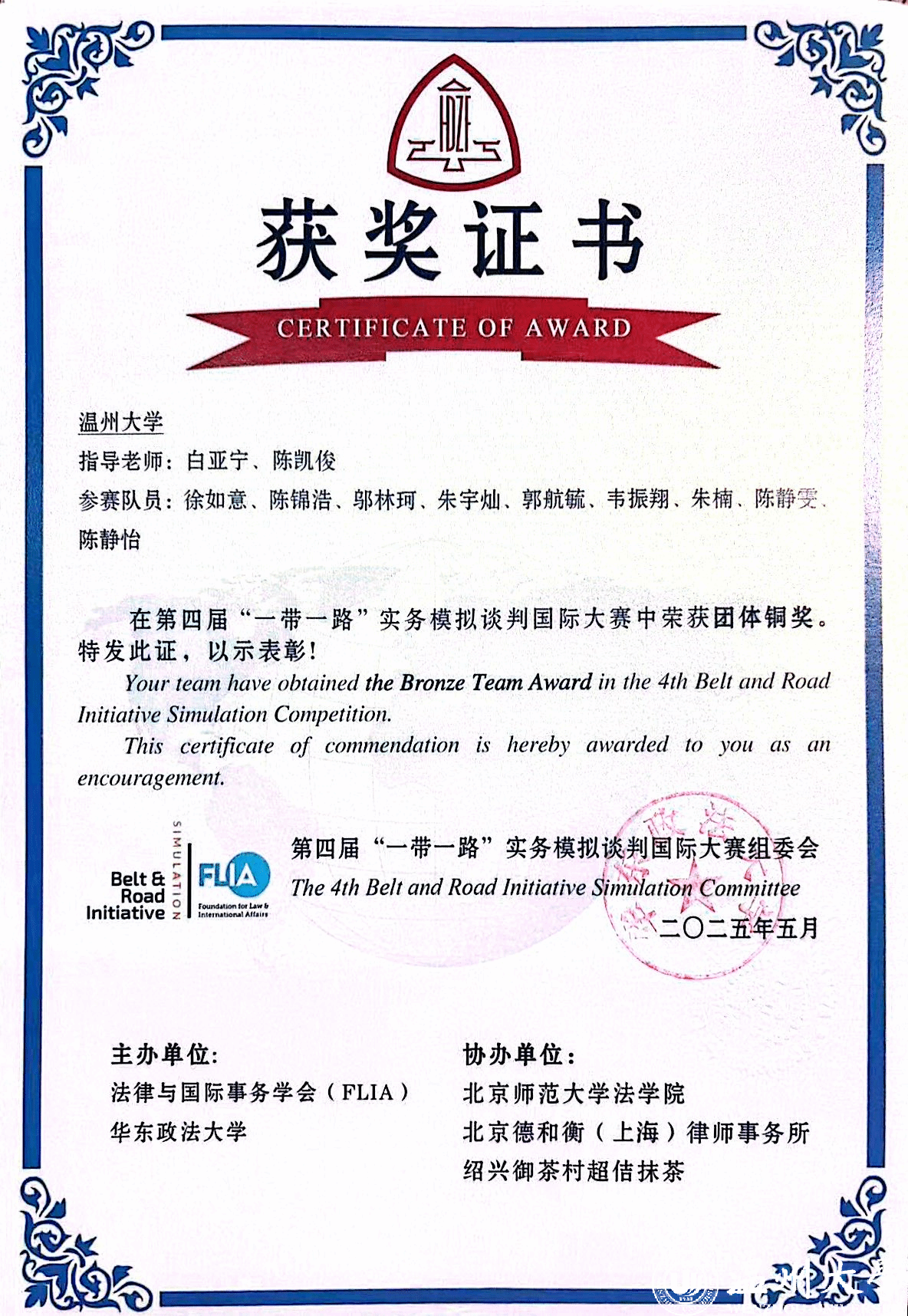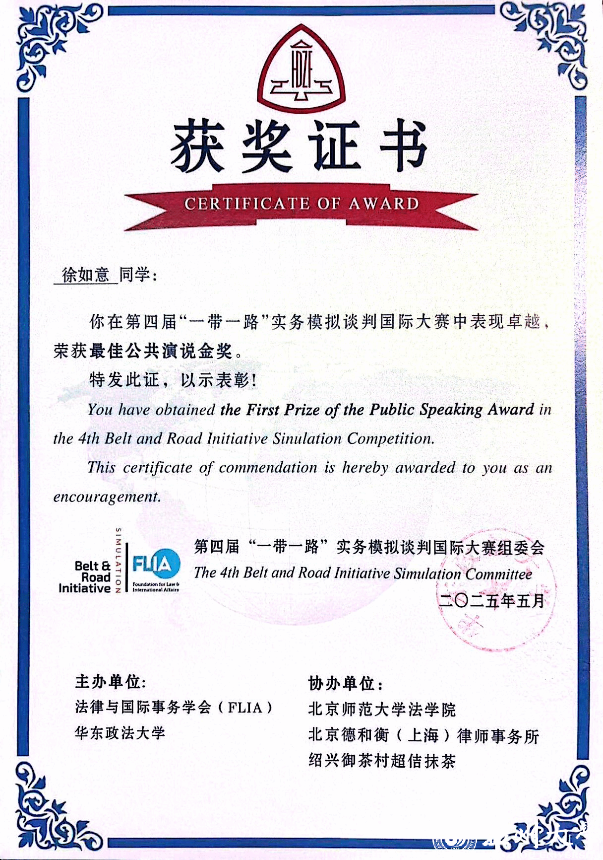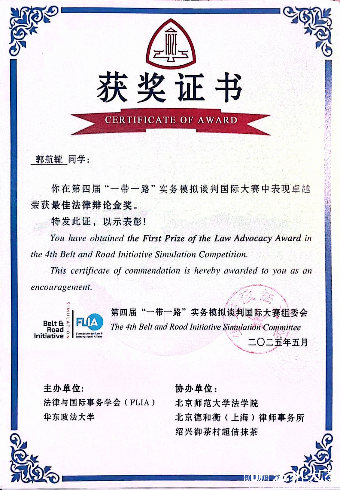 2025年5月10日至11日,第四届“一带一路实务模拟谈判国际大赛”在华东政法大学松江校区圆满落幕!来自全国68所高校的精英学子齐聚一堂,以智慧与激情展开巅峰对决。在这场国际化的赛事中,av天堂 代表队凭借扎实的专业功底与默契的团队协作,勇夺团体铜奖! 23级国际经贸规则班郭航毓同学、23级法学2班徐如意同学分别获最佳法律辩论金奖、最佳公共演说金奖。